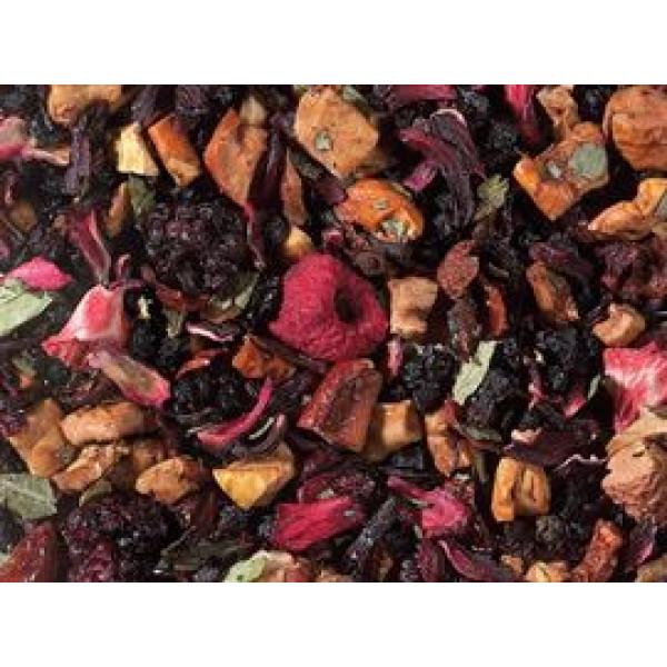 Zutaten: Fliederbeeren, Hibiskusblüten, Apfelstücke, Hagebuttenschalen, Aroma, gefr.-getr. ganze Brombeeren, gefr.-getr. ganze Himbeeren, Walderdbeerblätter, gefr.-getr. Erdbeerstücke.